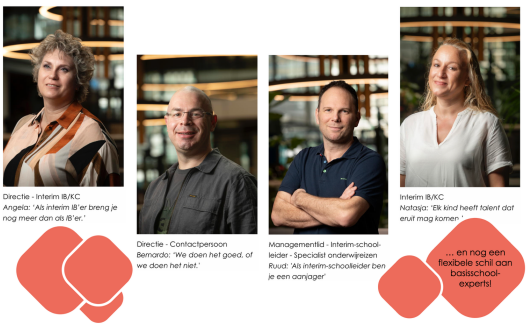 Met ons team van basisschoolexperts ondersteunen we veel basisscholen bij interim interne begeleiding/kwaliteitscoördinatie (IB/KC), interim schoolleiding/directie, coaching, training en onderwijsadvies. Wij kiezen altijd de beste oplossing voor jullie school. Kunnen wij die zelf niet bieden, dan selecteren wij de juiste expert uit ons netwerk.
